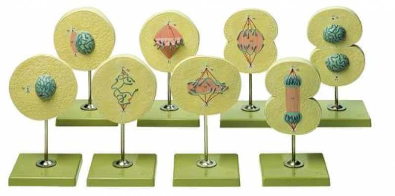 vielfach vergrößert, aus SOMSO-Plast®. Prophase, Metaphase, Anaphase und Telophase. Die 8 Modelle zeigen anschaulich das lichtmikroskopisch beobachtbare Geschehen der indirekten Kernteilung (Mitose) in der lebenden Zelle. Einzeln auf Stativ mit grünem Sockel.