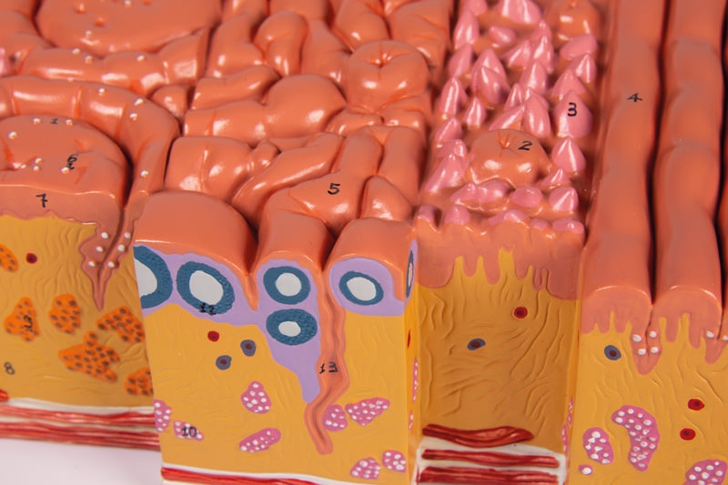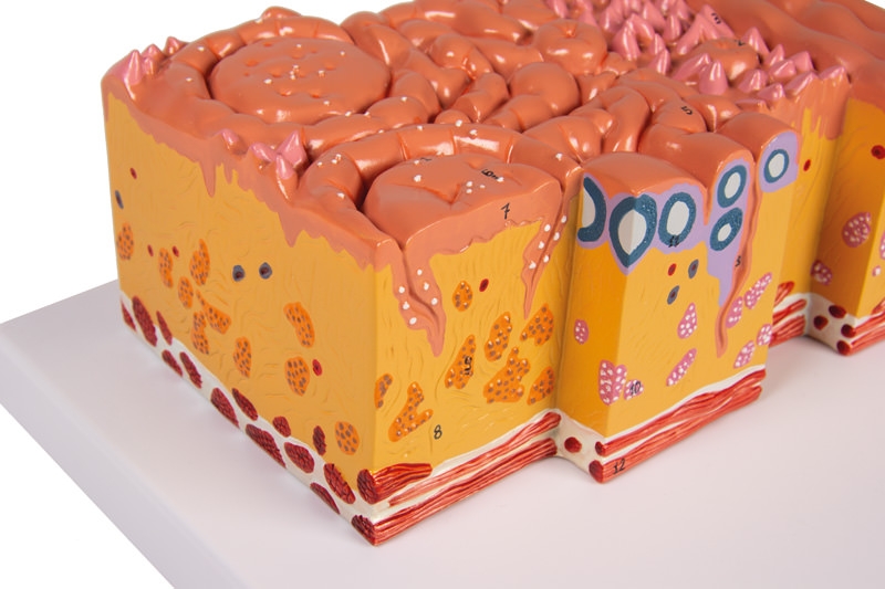Dieses Modell zeigt eine Zunge in Lebensgröße mit Gaumen- und Zungenmandel, Kehldeckel und Muskeln. Zusätzlich ist ein Ausschnitt des Zungengewebes in etwa 20facher Vergrößerung dargestellt. Die histologische Darstellung zeigt Geschmacksknospe, Schleim- und Speicheldrüse, Krypte und Muskulatur. Auf Sockelbrett.
