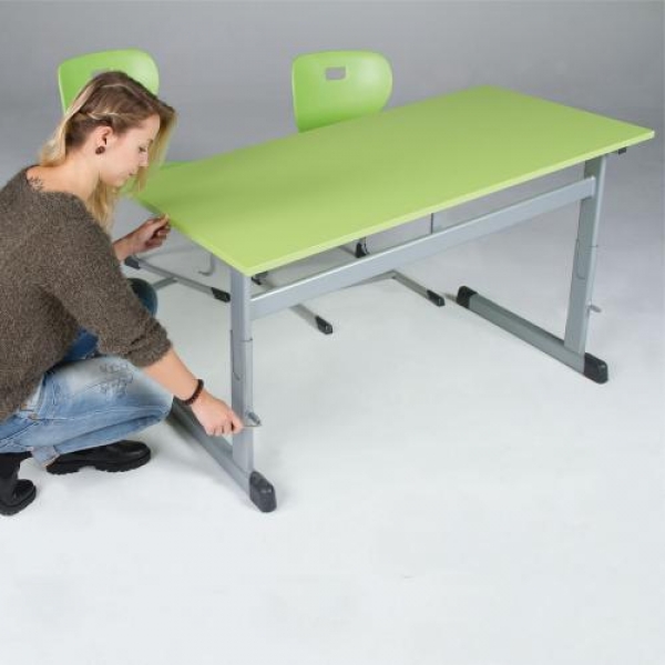 Die Tischtiefe ist in 55 cm oder 65 cm wählbar. Die Höhenverstellung ist in 2 Gruppen verfügbar, optimal passend für alle Klassenstufen der Grundschule (14) oder der weiterführenden Schulen (25).