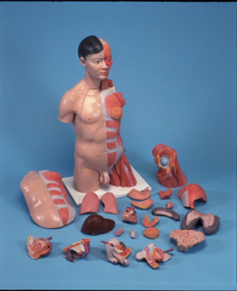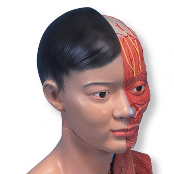 Weltweit einzigartig ist bei diesem lebensgroßen Torso der abnehmbare 6-teilige Muskelarm. Das hochwertige Modell gibt damit die Anatomie des kompletten menschlichen Oberkörpers umfassend wieder. Durch die hohe Detailtreue ist es für die qualitativ hochwertige Ausbildung an medizinischen Hochschulen besonders geeignet. Die rechte Hälfte zeigt Haut, die linke Hälfte die oberflächliche und tieferliegende Muskulatur mit Nerven, Gefäßen und knöchernen Strukturen. A bgerundet wird die Vielseitigkeit dieses auch ästhetischen Modells durch die genaue Darstellung der inneren Organe. Es ist zerlegbar in: