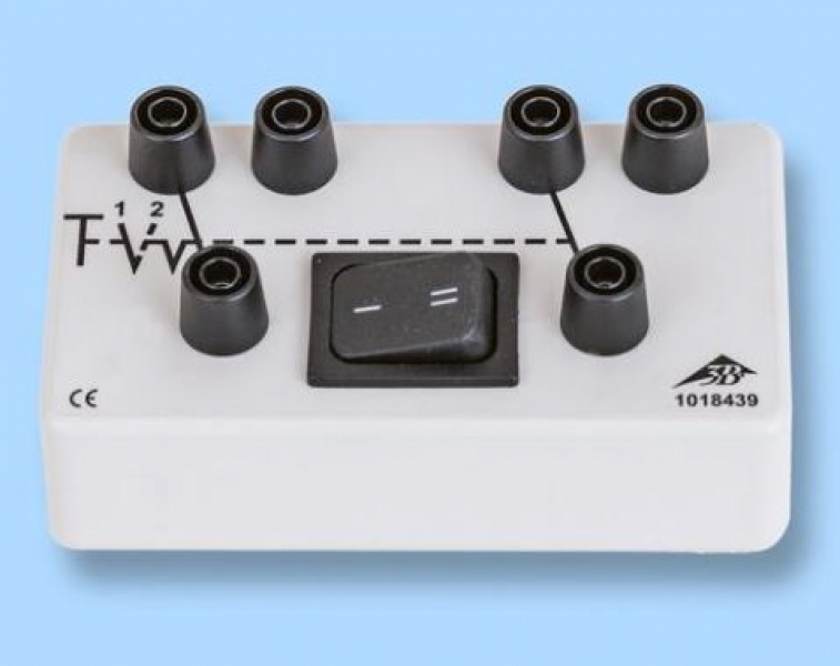 Zweipoliger Umschalter in stabilem Gehäuse mit hoher elektrischer Durchschlagsfestigkeit. Der Anschluss erfolgt über 4-mm-Sicherheitsbuchsen.