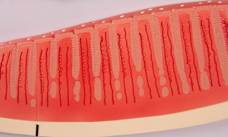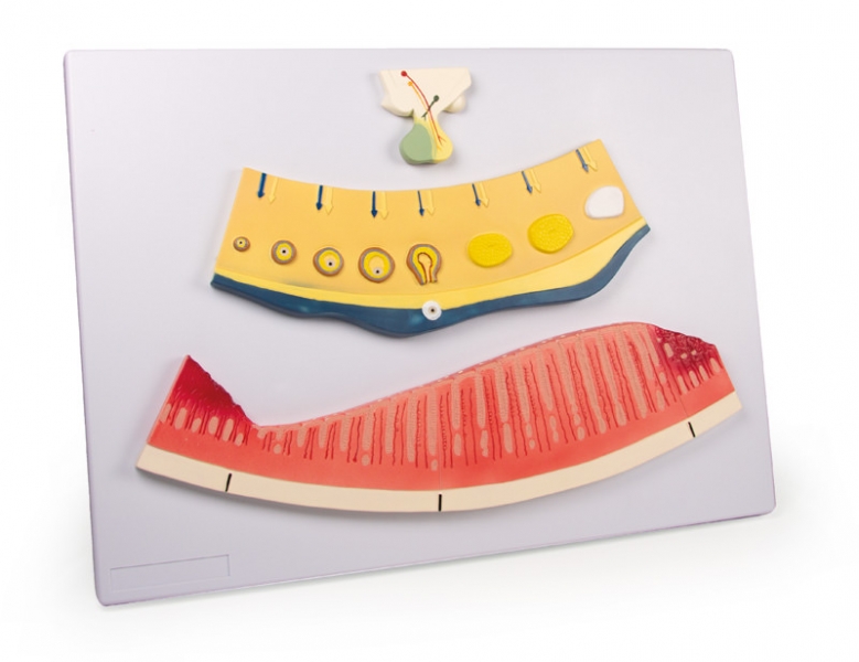 Dieses Modell zeigt die zyklischen VerÀnderungen im weiblichen Hormonhaushalt und ihre Auswirkungen auf die Uterusschleimhaut (Ursache der Menstruation). Modell auf Grundbrett montiert.