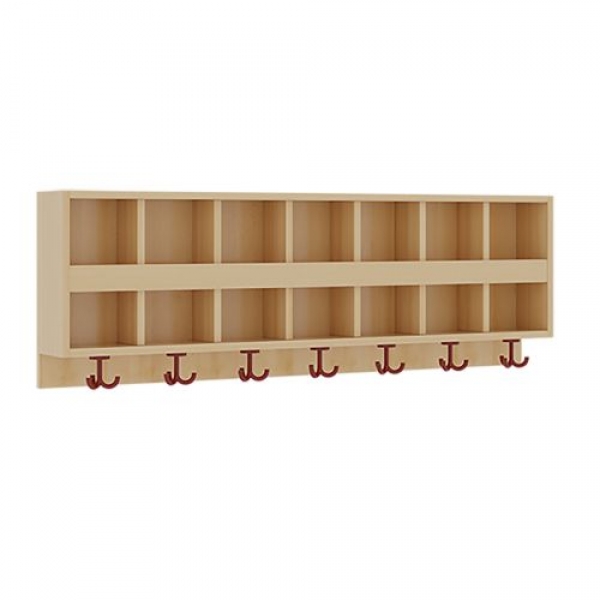 Die Ablagen aus melaminbeschichteter Spanplatte haben 15 und 17 cm hohe Fächer sowie eine Bilderleiste, darüber 5 cm hohe Ablagen, das Dekor ist wählbar. Unter der Fachablage sind in Anzahl der Plätze farbige drehbare Dreifachhaken montiert. Die Breite und damit die Anzahl der Plätze sind wählbar.