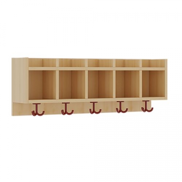 Die Ablagen aus melaminbeschichteter Spanplatte haben 17 cm hohe Fächer und darüber 5 cm hohe Ablagen, das Dekor ist wählbar. Unter der Fachablage sind in Anzahl der Plätze farbige drehbare Dreifachhaken montiert. Die Breite und damit die Anzahl der Plätze sind wählbar.