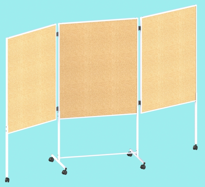 mobile Moderationswand 2 x Tafelfläche 90 x 120 cm 1 x Tafelfläche 100 x 120 cm 2 einfaltbare Tafelflächen / 1 große Tafelfläche Gesamthöhe inkl. fahrbaren Gestell: ca. 180 cm Oberfläche mit Korkoberfläche zum anpinnen beidseitig nutzbar fahrbar auf 6 Rollen mit T-Fußstativ Lieferung per Spedition