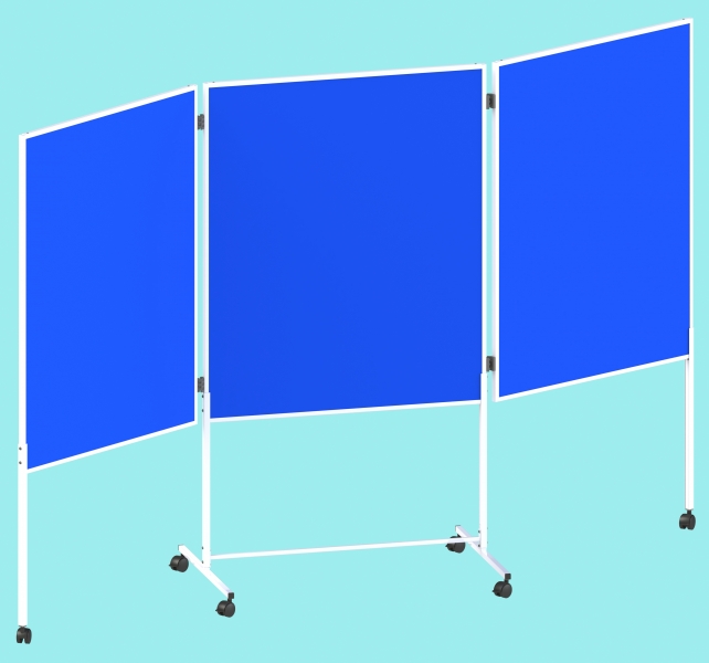 mobile Moderationswand 2 x Tafelfläche 90 x 120 cm 1 x Tafelfläche 100 x 120 cm 2 einfaltbare Tafelflächen / 1 große Tafelfläche Gesamthöhe inkl. fahrbaren Gestell: ca. 180 cm Oberfläche mit Stoffoberfläche zum anpinnen beidseitig nutzbar fahrbar auf 6 Rollen mit T-Fußstativ - Lieferkosten ggf Anfragen / Lieferung per Spedition